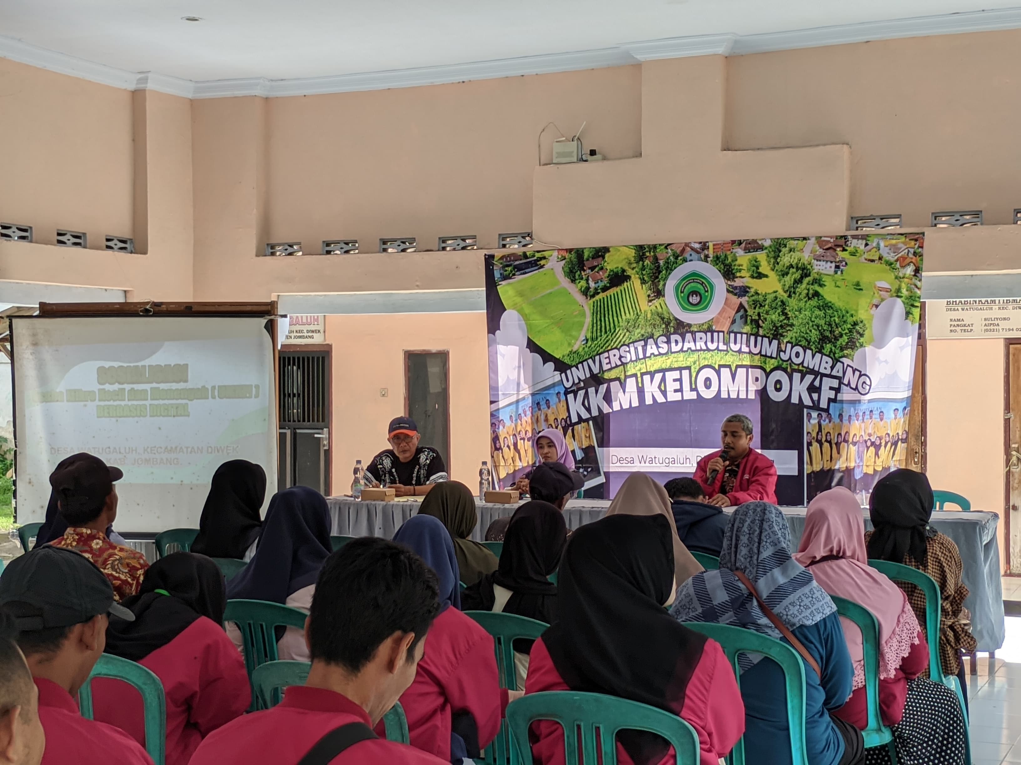 Kelompok Kuliah Kerja Mahasiswa (KKM) Universitas Darul Ulum (Undar) Jombang Kelompok F, bekerja sama dengan Dinas Perdagangan dan Perindustrian Kabupaten Jombang menyelenggarakan kegiatan Sosialisasi Standardisasi UMKM Menuju Pengembangan UMKM Berbasis Digital pada Jumat (14/2). Kegiatan ini berlangsung di Balai Desa Watugaluh, Kecamatan Diwek, Jombang, dan diikuti oleh perwakilan IKM sebanyak 20 pelaku Usaha Mikro, Kecil, dan Menengah (UMKM) setempat.